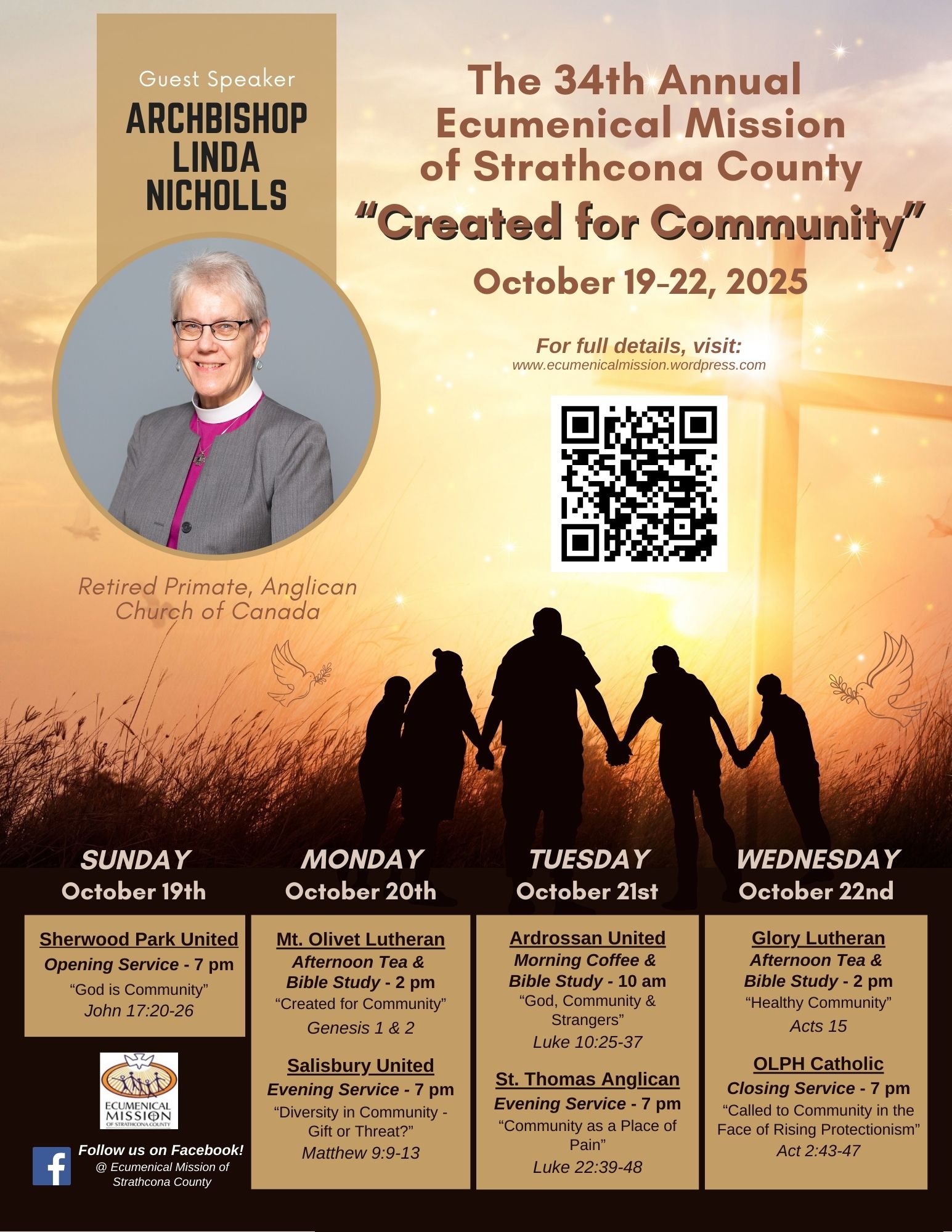We are delighted to invite you to the 34th Annual Ecumenical Mission of Strathcona County, taking place October 19–22, 2025.