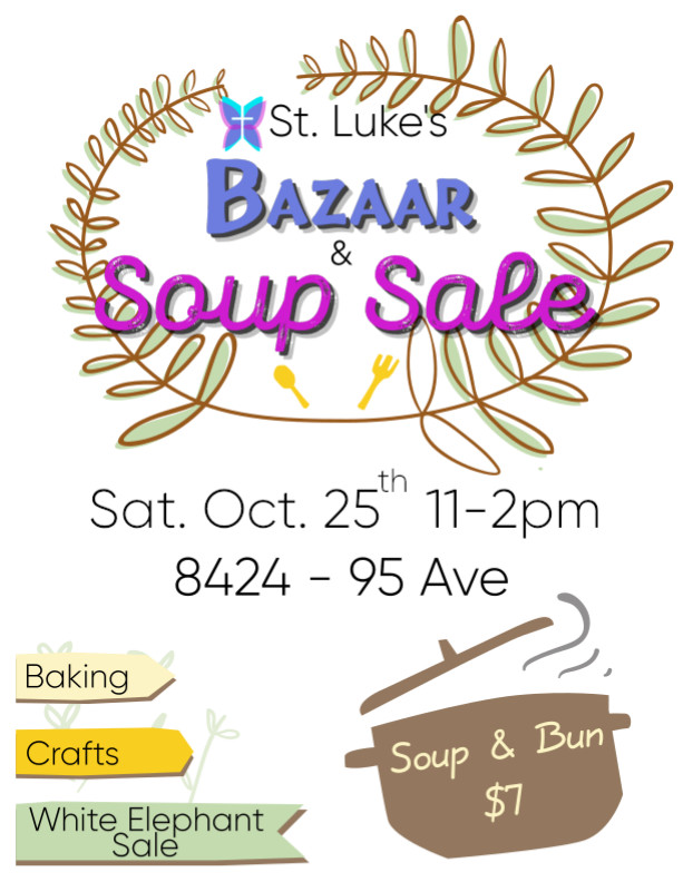 St. Luke's warmly invites you to our annual Bazaar and Soup Sale on Saturday, Oct. 25, from 11 a.m. to 2 p.m. Enjoy a hearty soup and bun lunch for $7, and take time to browse a wonderful selection of baked goods, handcrafted items, and treasures at our White Elephant Sale. All are welcome