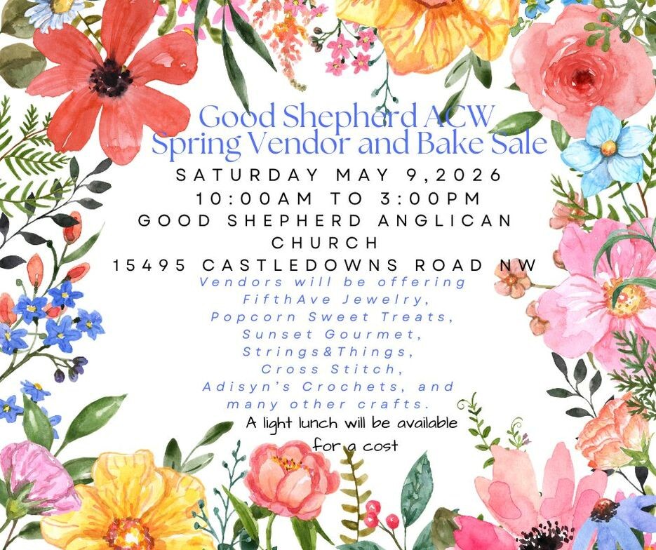Good Shepherd's Anglican Church Women are kicking off spring with their annual Spring Bake Sale. This year, vendors include: Fifth Ave Jewelry, Popcorn Sweet Treats, Sunset Gourmet, Strings & Things Cross Stitch, Adisyn's Crochet, and more.