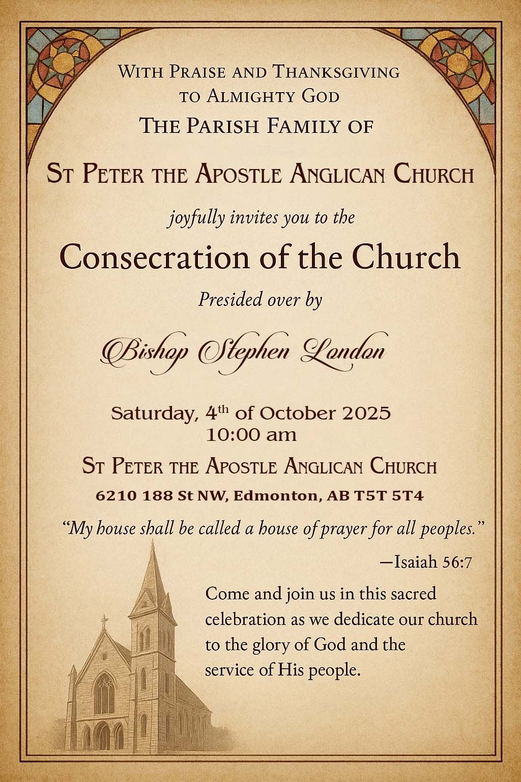 Please join Bishop Stephen London and the Anglican Diocese of Edmonton for the consecration of St. Peter the Apostle Anglican Church on Saturday, October 4, 10 am, at 6210 188 St NW, Edmonton. All are welcome! Read St. Peter's Story