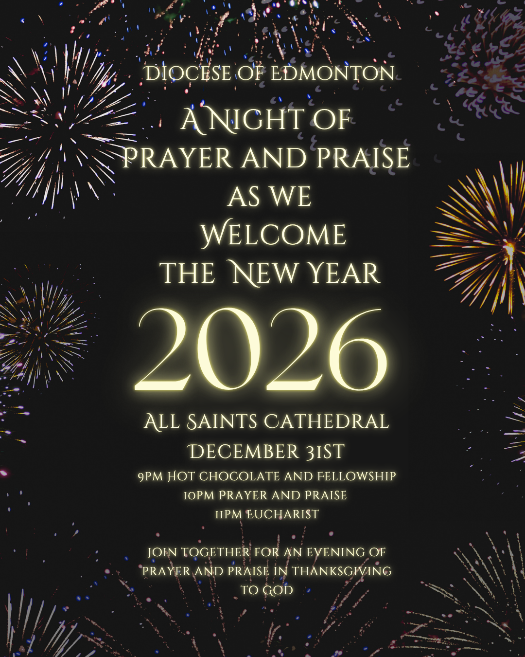 This December 31, join worshippers from across the Diocese as we welcome 2026 with an evening of prayer and praise at All Saints' Cathedral.