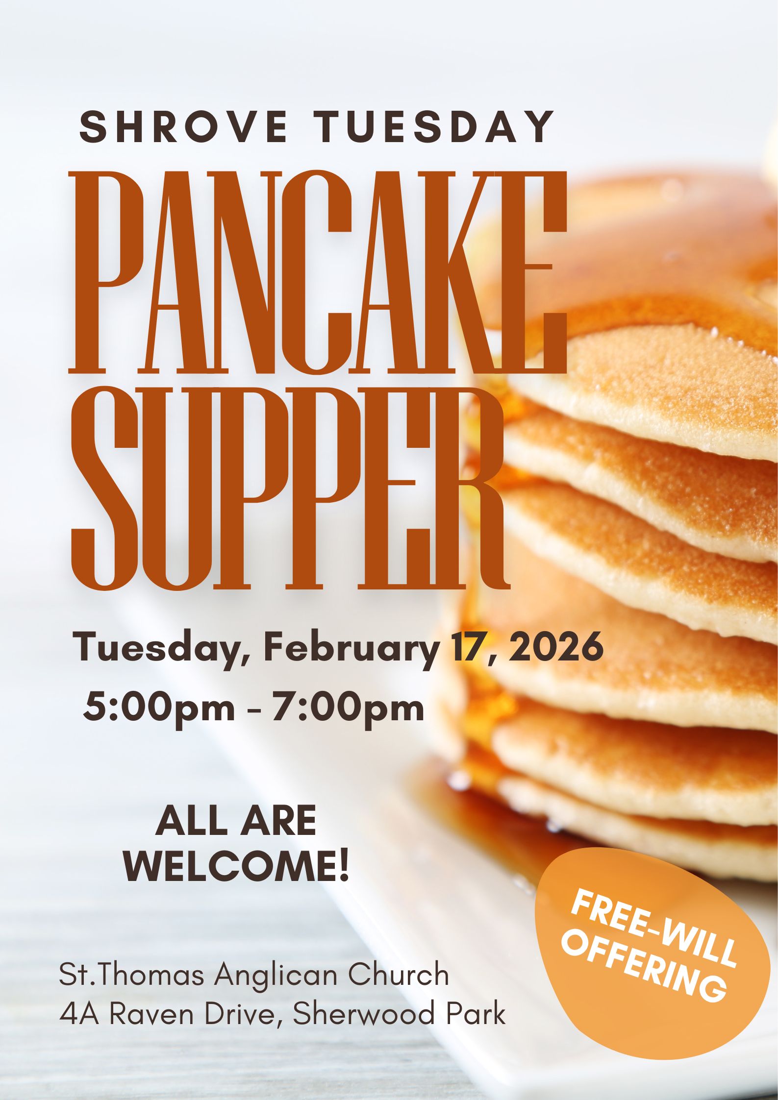 St.Peter's Anglican Church is once again partnering with the 26th St.Peter's Scouts Troop to put our annual Shrove Tuesday Pancake Dinner. The 26th Scouts Troop and the St.Peter's congregation welcome everyone who would like to join us for this community event . It will be in the St. Peter's Church Hall from 5 pm to 7 pm on February 17, 2026. Everyone is welcome! If you have any questions please feel free to email us at stpeters.edm@gmail.com.  POSTER