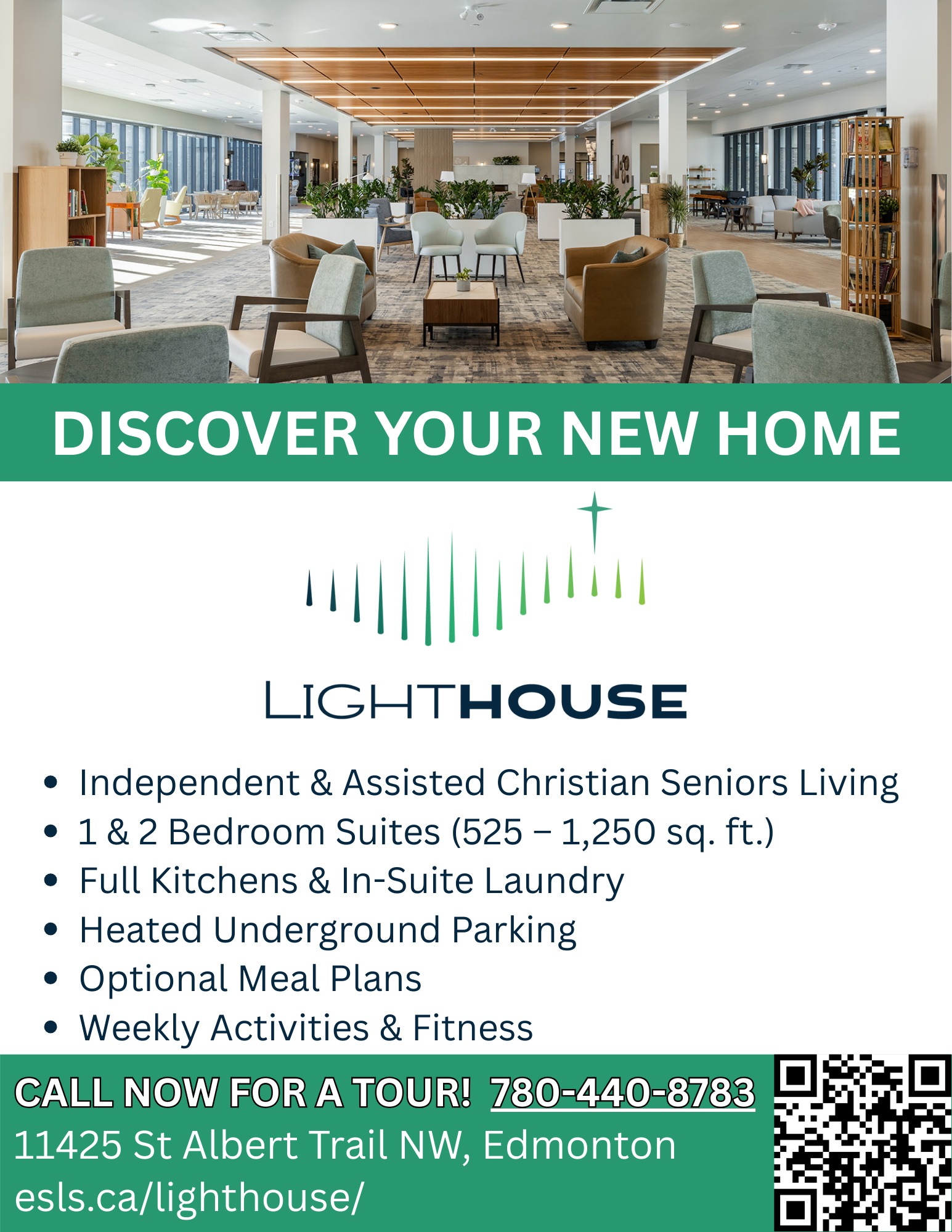 Lighthouse has been open for almost one year. We have vacancies in all suite types, including one bedroom, two bedroom, and two bedroom plus den. Monthly rental rates start at $1675 per month*.  Many suites have in-suite laundry, balconies and two bathrooms.  All residents have access to our library, hair salon, café, optional meal programs, events and activities, fitness equipment and heated underground parking with carwash bay. We also have two guest suites for your out-of-town guests. If you have a seniors group in your congregation, we’d love to host them for lunch and a tour! Private tours are also available anytime by contacting 780.440.8783. POSTER