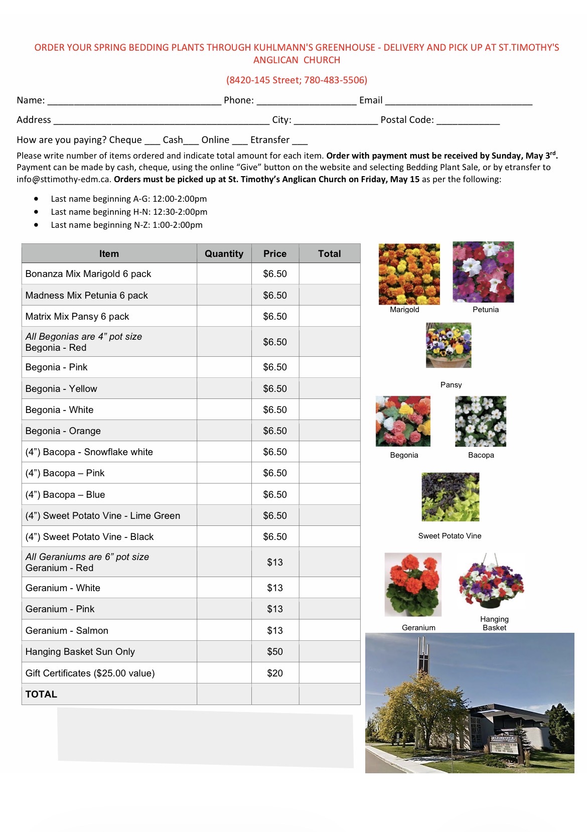 St. Timothy's Annual Plant Sale Fundraiserorder by May 3, pick up on May 15
